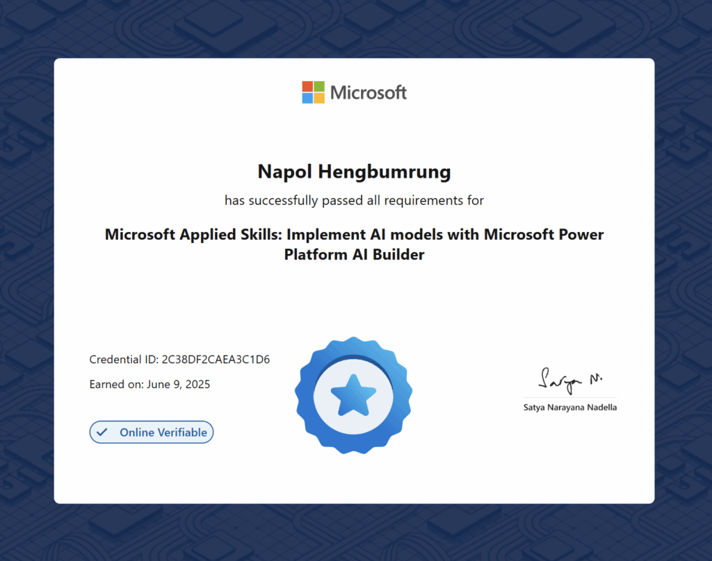 “เรา 2 คนมีประสบการณ์ตรงทั้งการสอนและการลงมือทำจริงในด้าน Generative AI, Microsoft 365 Copilot, Copilot Studio และ Power Platform (Power BI, Power Apps, Power Automate ทั้ง Cloud และ Desktop)รวมถึงการออกแบบและจัด Workshop Hackathon และ Design Thinking ให้กับบริษัทชั้นนำในประเทศไทยอย่างต่อเนื่อง